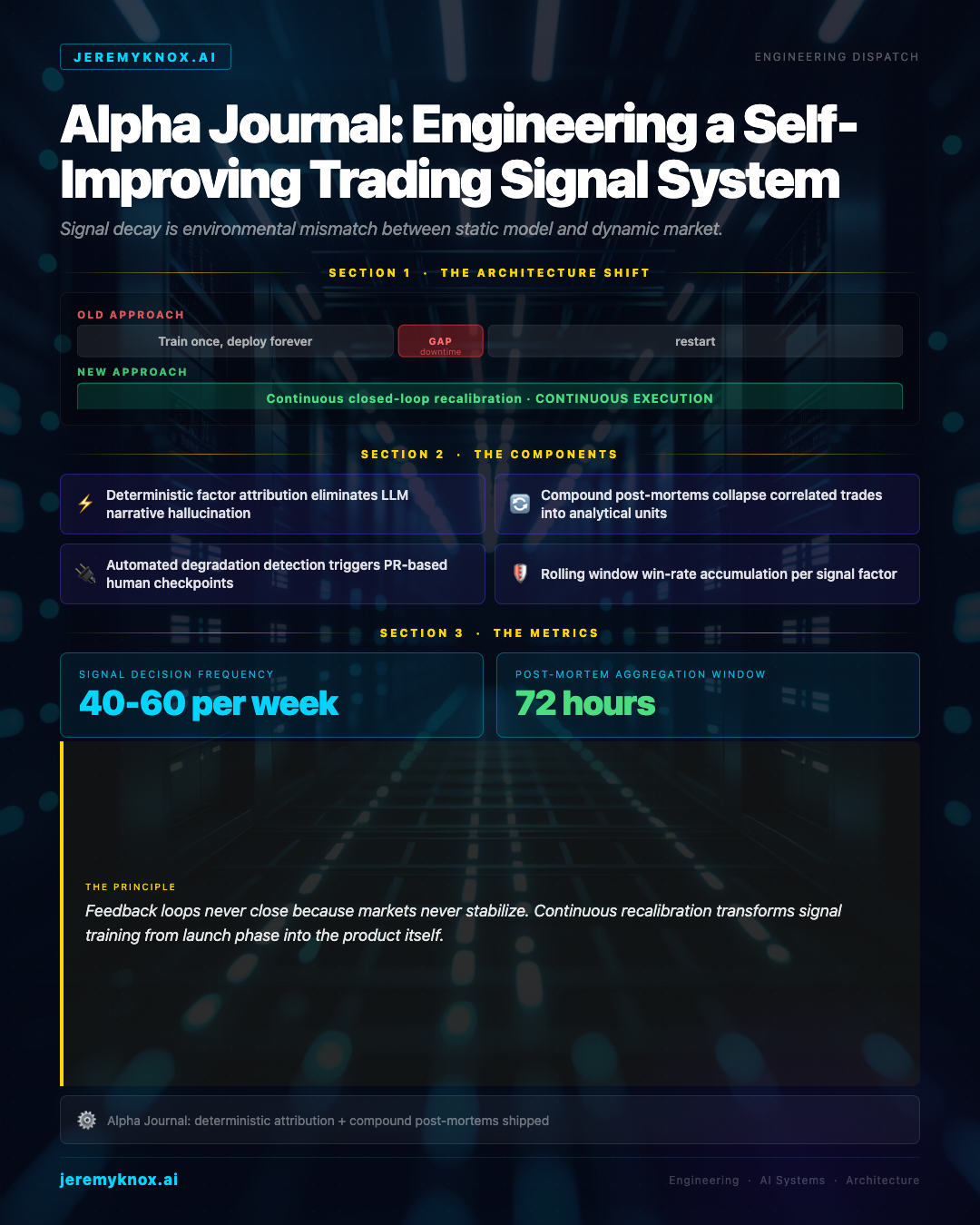 The engineering insight that makes this work isn't novel in isolation. Closed feedback loops are standard in control theory, adaptive systems, and military doctrine. What's unusual is applying that rigor to trading signal weights with full deterministic attribution, automated degradation detection, and a PR-based human checkpoint before any parameter changes reach production.